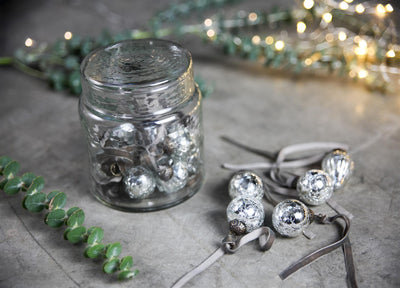 Inspired by traditional sweet jars, these elegant glass pots are filled with a selection of traditional silver glass baubles in mixed shapes. Easy to store and keep safe year after year. Both the jar and decorations are made from recycled glass. Each set includes sixteen baubles and velvet hanging ties.