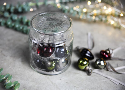 Inspired by traditional sweet jars, these elegant glass pots are filled with a selection of traditional glass baubles in a mix of festive colours and shapes.