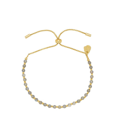 This classic Amelia bracelet is dotted with Labradorite quartz and gold plated beads with a slider fastening, making it suitable for any wrist size. Labradorite quartz is believed to bring courage, encouraging you to follow your dreams. The slider fastening means it will be suitable for any wrist size!