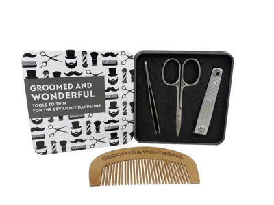 A Groomed and Wonderful kit! This desirable set for modern gents features all the tools of the trade required to keep them looking stylish and well-groomed all year round. It includes an elegant pear wood comb, fold-away nail clippers, sturdy stainless-steel scissors and tweezers. The kit is perfect for home or travel use and is stored in a stylish metal tin.