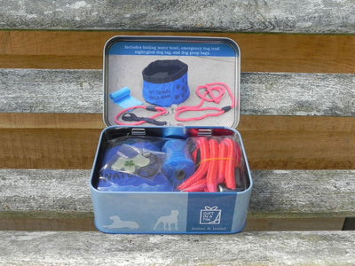 A useful kit containing many of the essentials for dog owners neatly contained in an attractive and compact storage tin. A great gift for dog lovers and ideal for keeping in the car when you are out and about with your canine friends.
