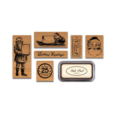 Cavallini - Tin of 6 Rubber Stamps - Vintage Christmas HOLVIN - Black Ink Stamp Pad Included