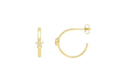 With a minimal, flat open hoop, a Cubic Zirconia star sits in the middle of each hoop for a pop of shine. The perfect base to any ear stack, you can layer with any of our other gold plated earrings for a complete look.