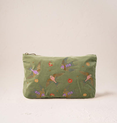 Elizabeth Scarlett - Velvet Everyday Pouch/Clutch - Swallows - 20 x 30cms - Olive Green