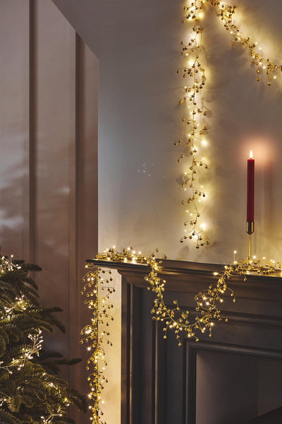 The Golden Bells light chain from Lightstyle London has golden coloured beads and bells interspersed along the chain of LED lights. When the lights are on the beads twinkle.