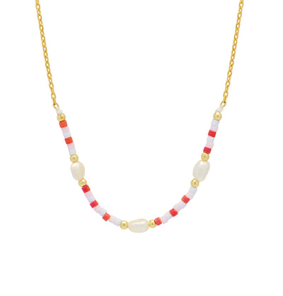 A playful necklace that's sure to brighten up your day. Estella Bartlett's gold-plated Pearl Miyuki Necklace features a series of red and pink miyuki beads with pearls dotted inbetween.