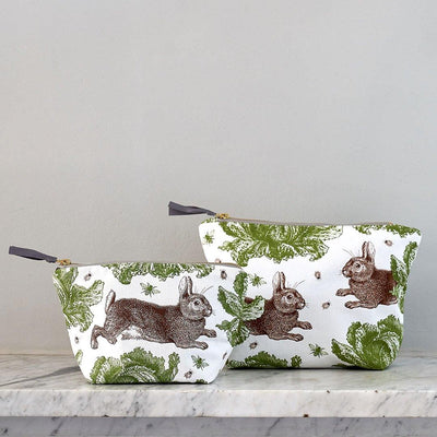 White cosmetic bag hand printed with brown rabbits and green cabbages available in 2 sizes: