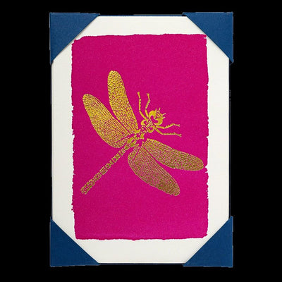 Archivist's small letterpress card with a deep pink background featuring a gold foil dragonfly.