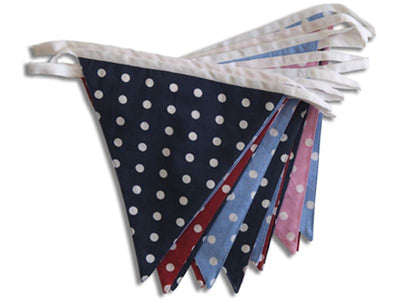 Go absolutely dotty over our Spotty Dotty Bunting, the perfect way to decorate any bedroom or playroom and create a traditional fairground feel. Triangular flags in a combination of pink, blue and red fabrics are adorned with funky white polka dots for a unique addition to any room or party.