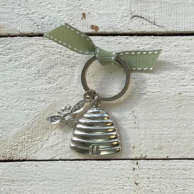 A pewter bee and a hive feature on this keyring along with along a ribbon trim.