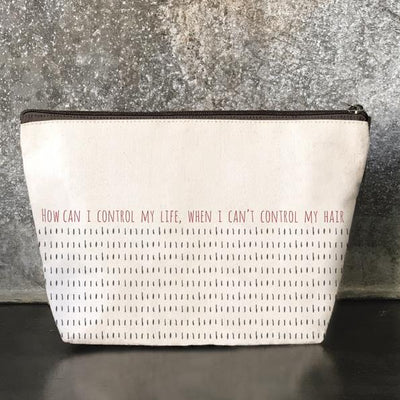 'How Can I Control My Life, When I Can't Control My Hair' cosmetic bag with a zipped top