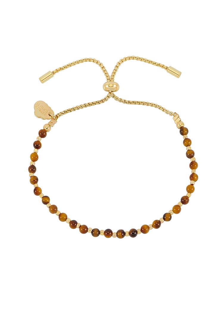 The classic Amelia bracelet is dotted with Tiger's Eye and gold plated beads with a slider fastening, making it suitable for any wrist size. Once considered more precious than gold, Tiger's Eye is said to aid focus & inner strength. This stone is most recognised for its earth tones and unique appearance.