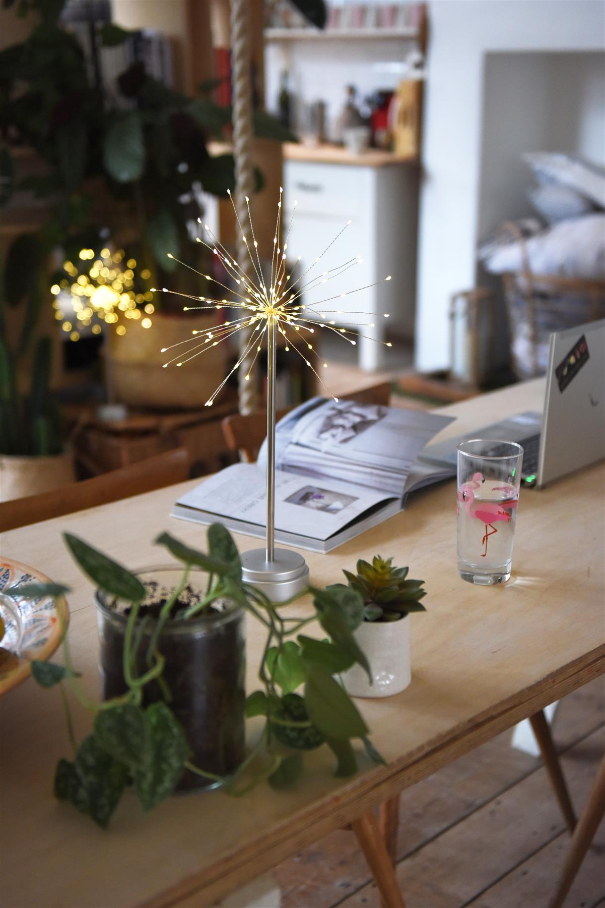 The Silver Starburst table top light makes a spectacular sight! Simple to assemble; open tie, fan out each branch to create an evenly spaced round space. Once assembled, switch on, sit back and marvel.....