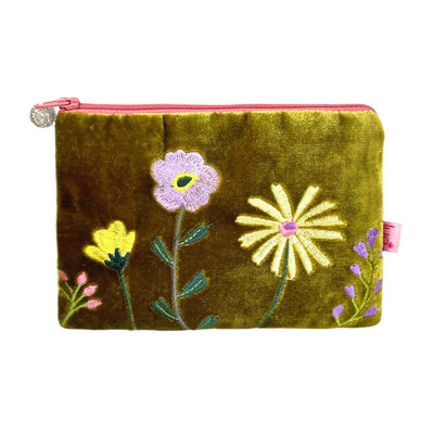 Lua - Velvet Coin Purse - Embroidered Wildflowers - 11 x 16cms - Golden Yellow/Pink Zip