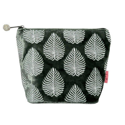 Lua - Velvet Cosmetic Make Up Bag/Purse - Embroidered Leaf - 18 x 14cms - Dark Sage Green/Light Grey Leaves