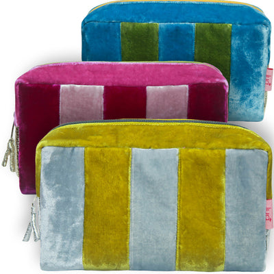 Striking silk velvet cosmetic make up bags in a stripey patchwork design, finished off with a beaded ball zip detail.