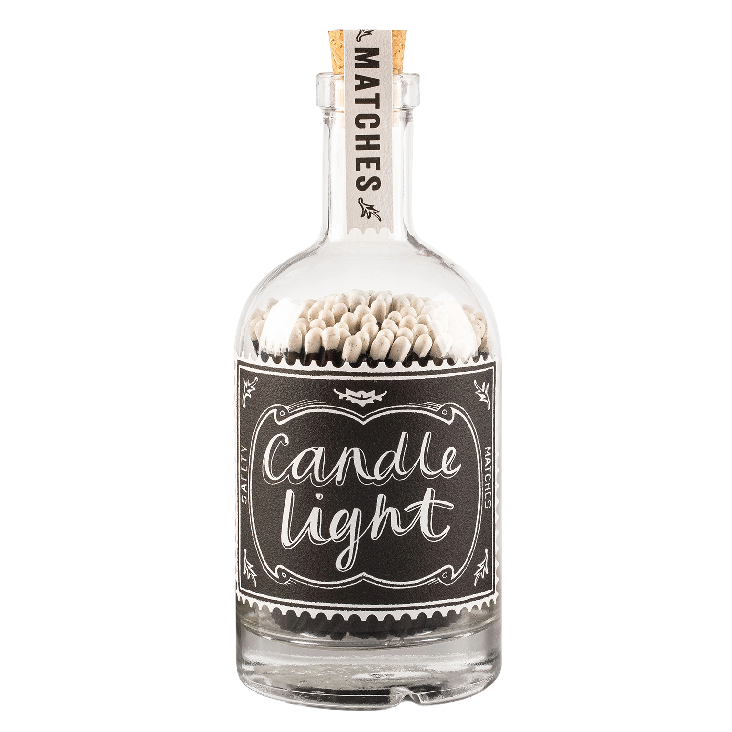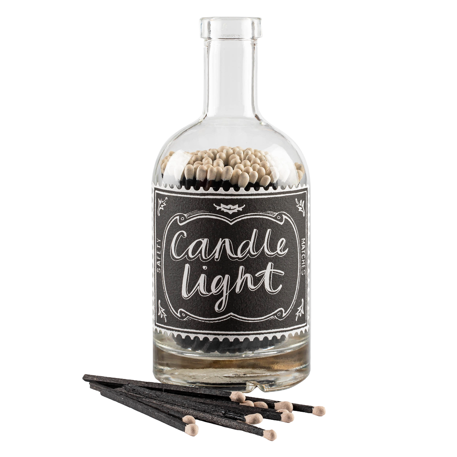 These match bottles feature vintage stamp-inspired labels with a black background and the words 'Candle Light' in a white, cursive, handwritten font and a white detailed border.