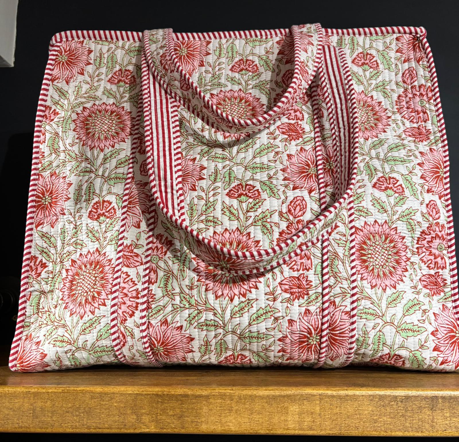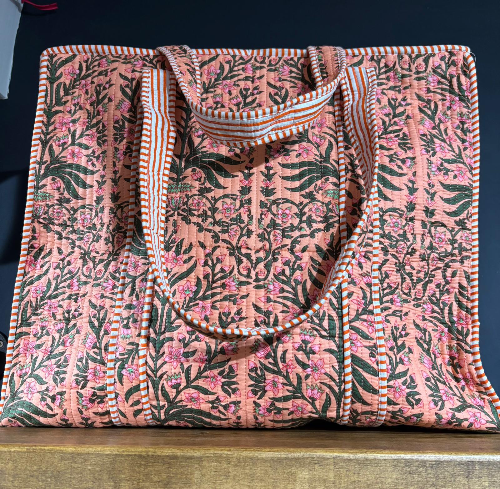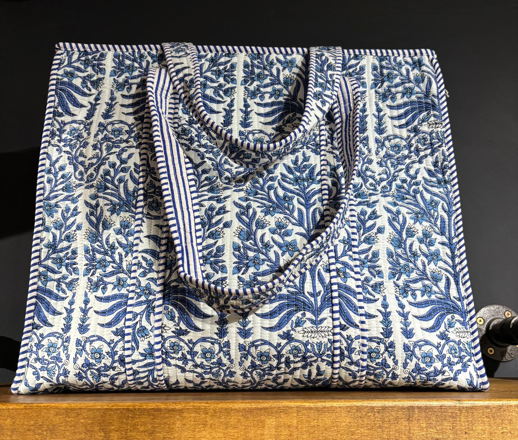 Jaipur Block Print Zipped Tote Shopping Bag - 100% Cotton Hand Stitched & Hand Printed - 38x41x13cms