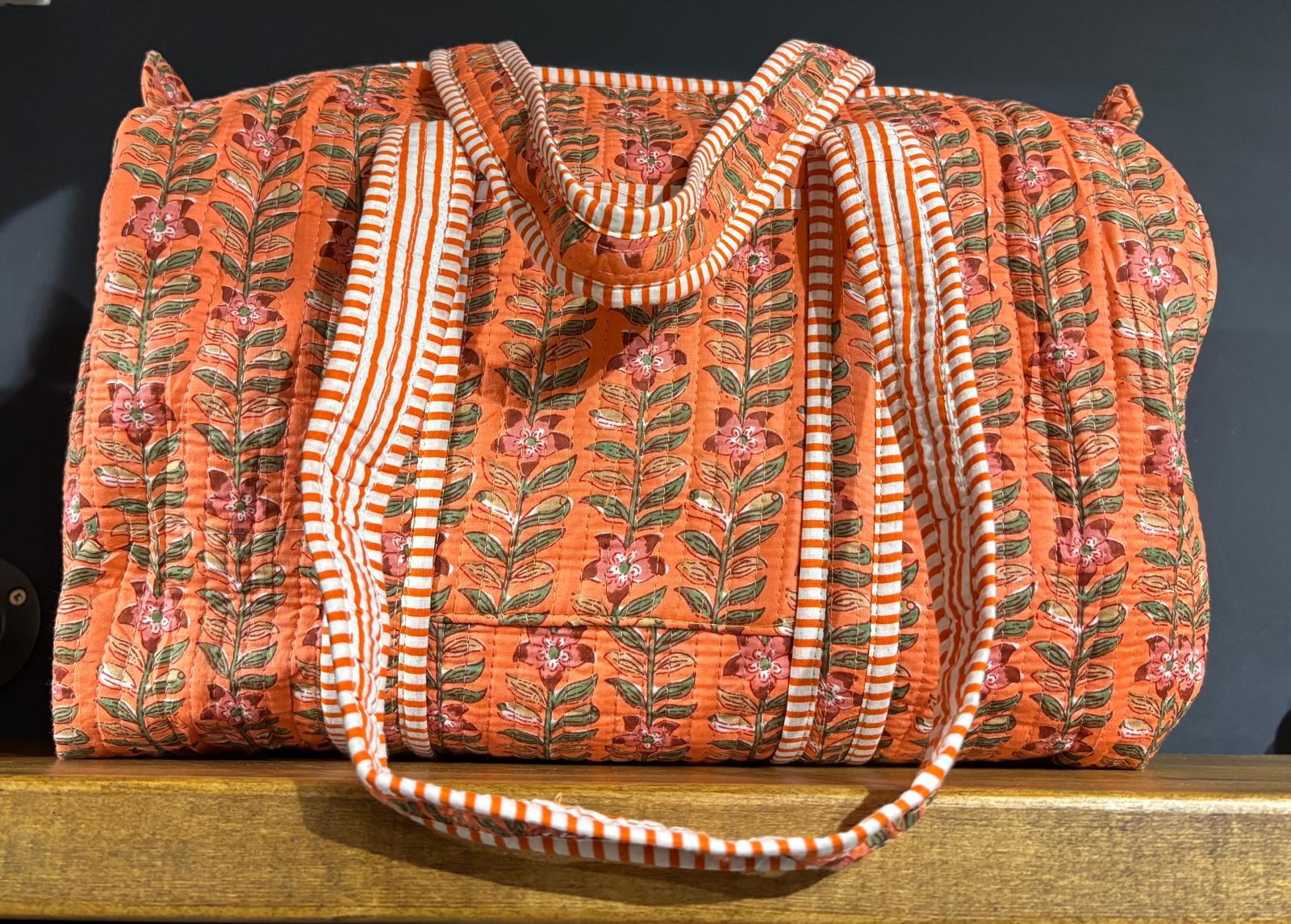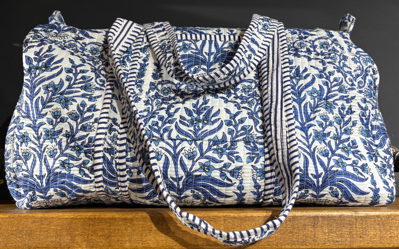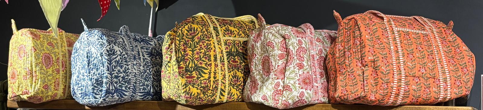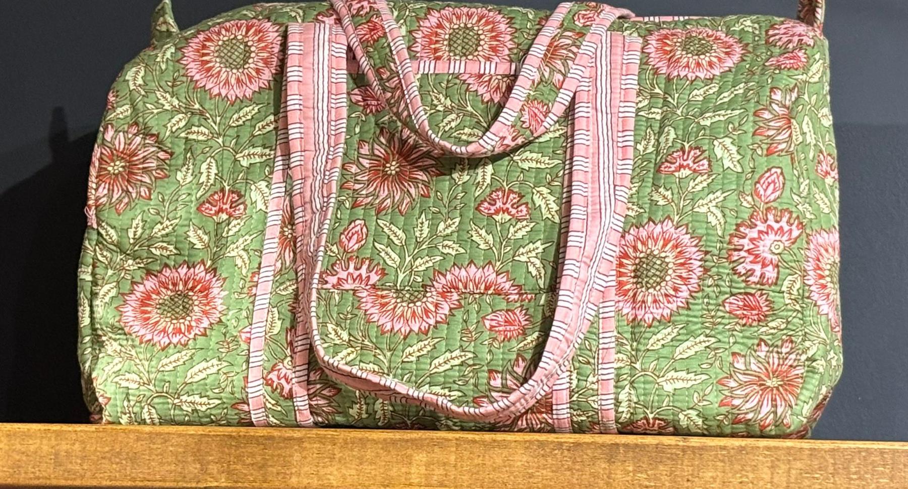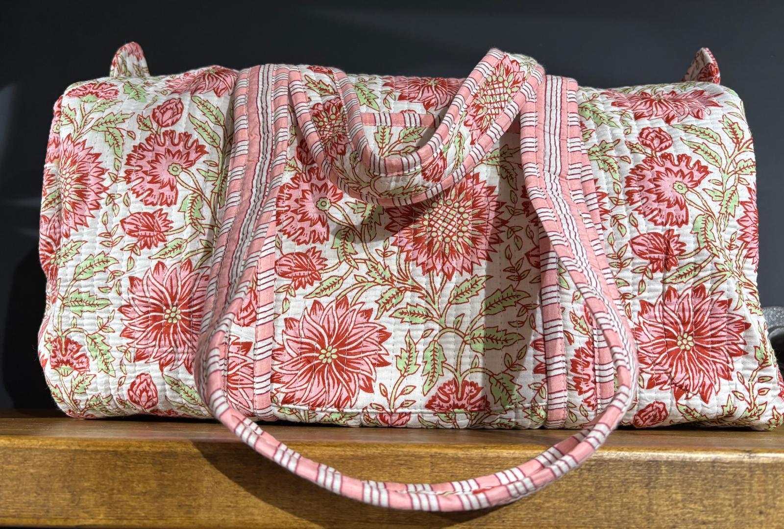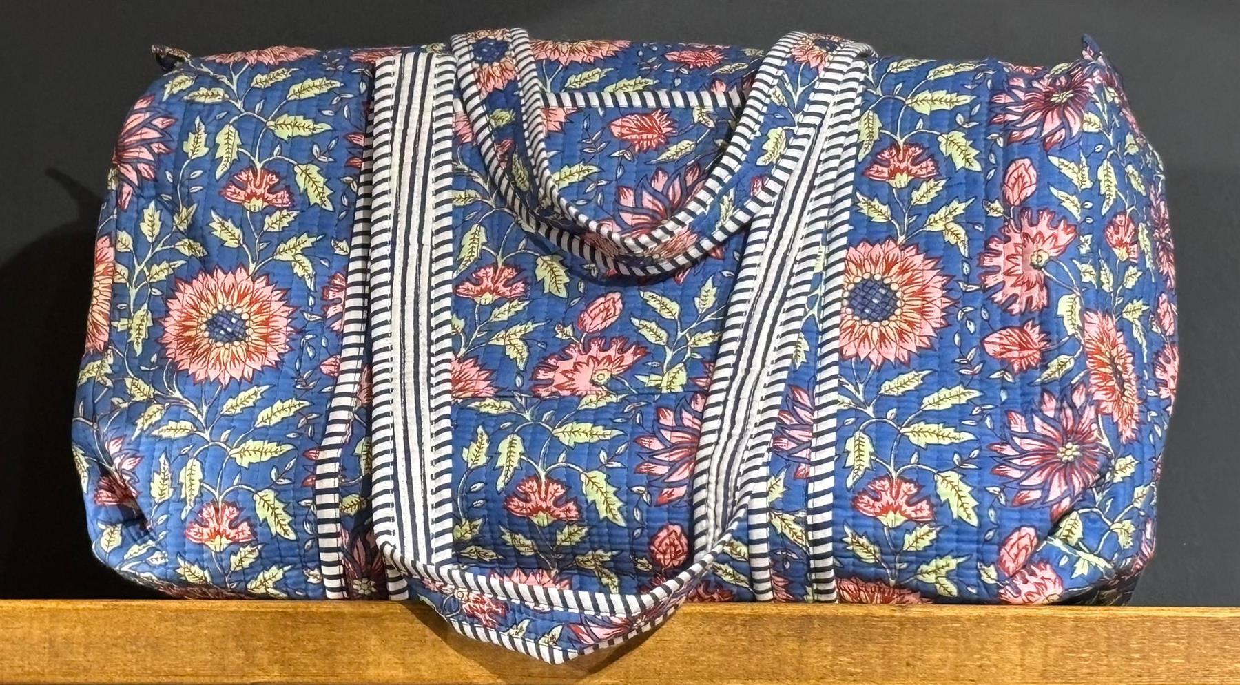 Beautiful MadMolly hand-block printed weekend barrel bags are made for us in Jaipur, India.