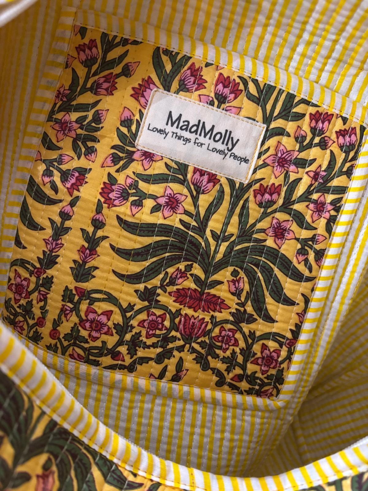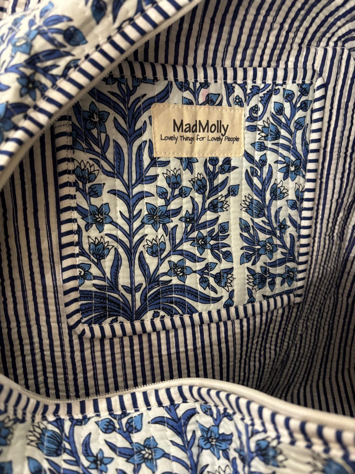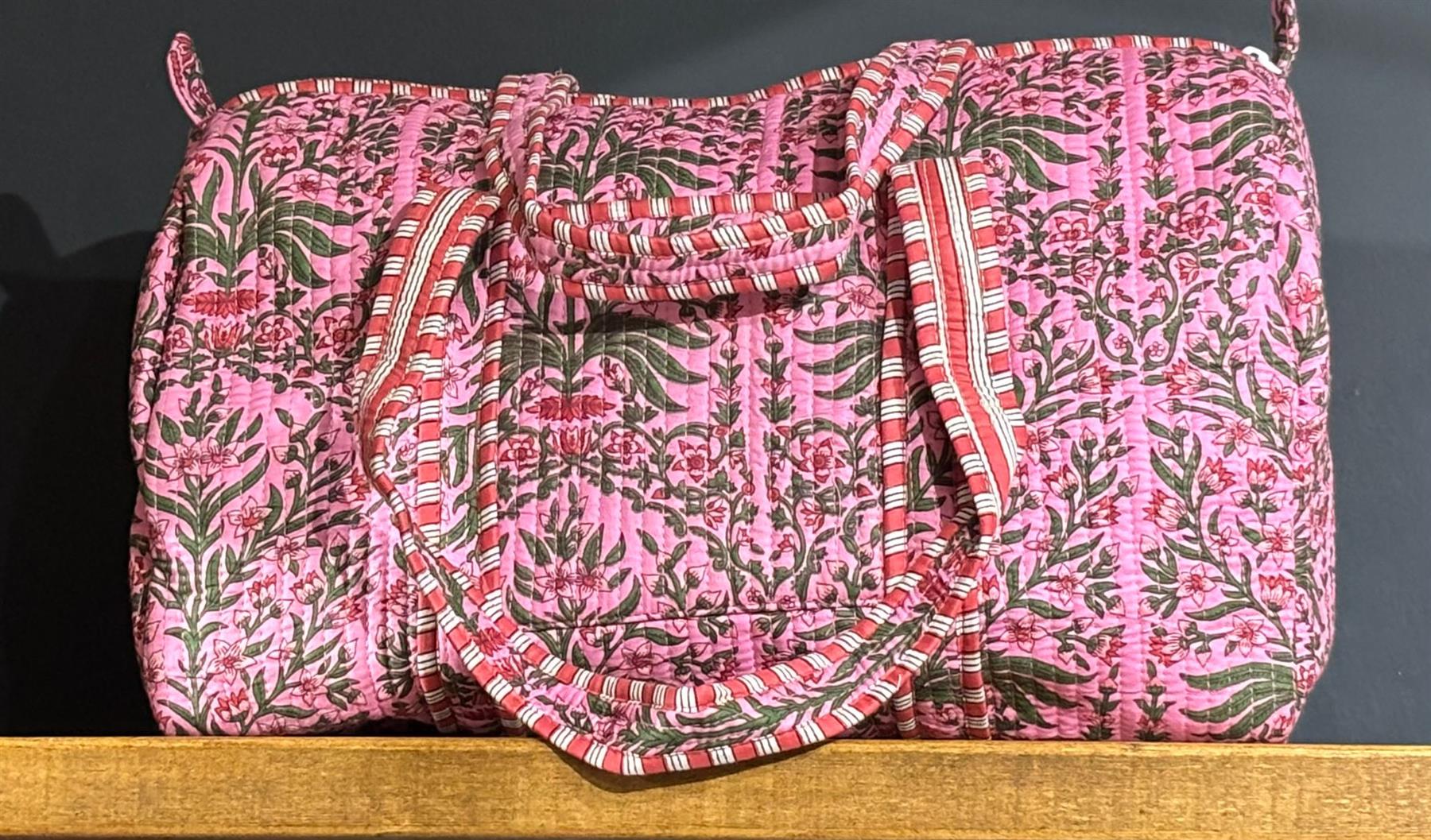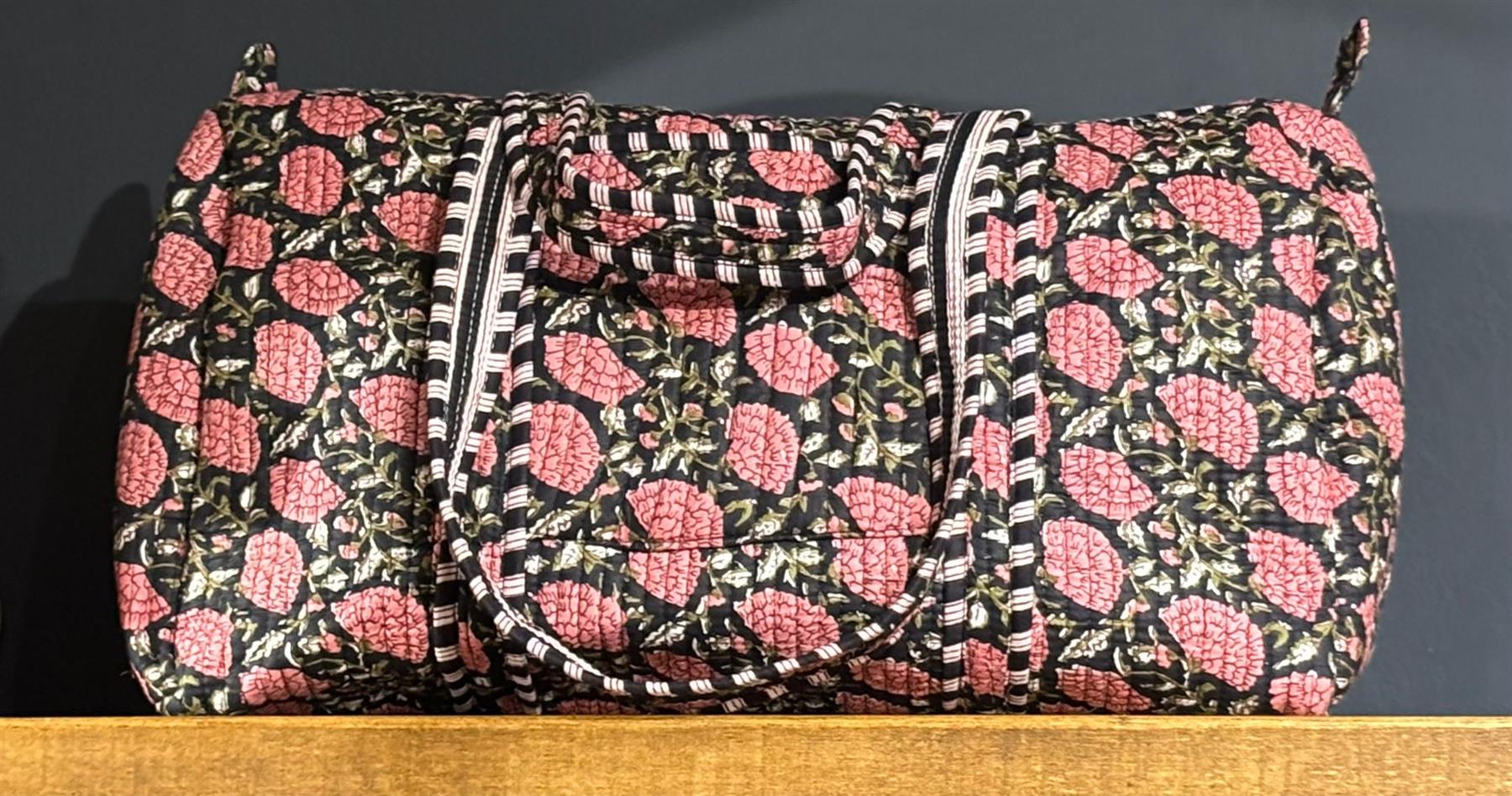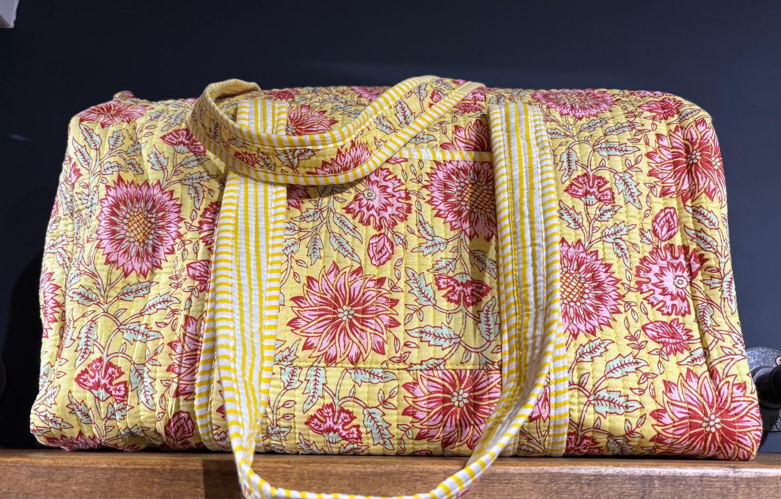 Beautiful MadMolly hand-block printed weekend barrel bags are made for us in Jaipur, India.
