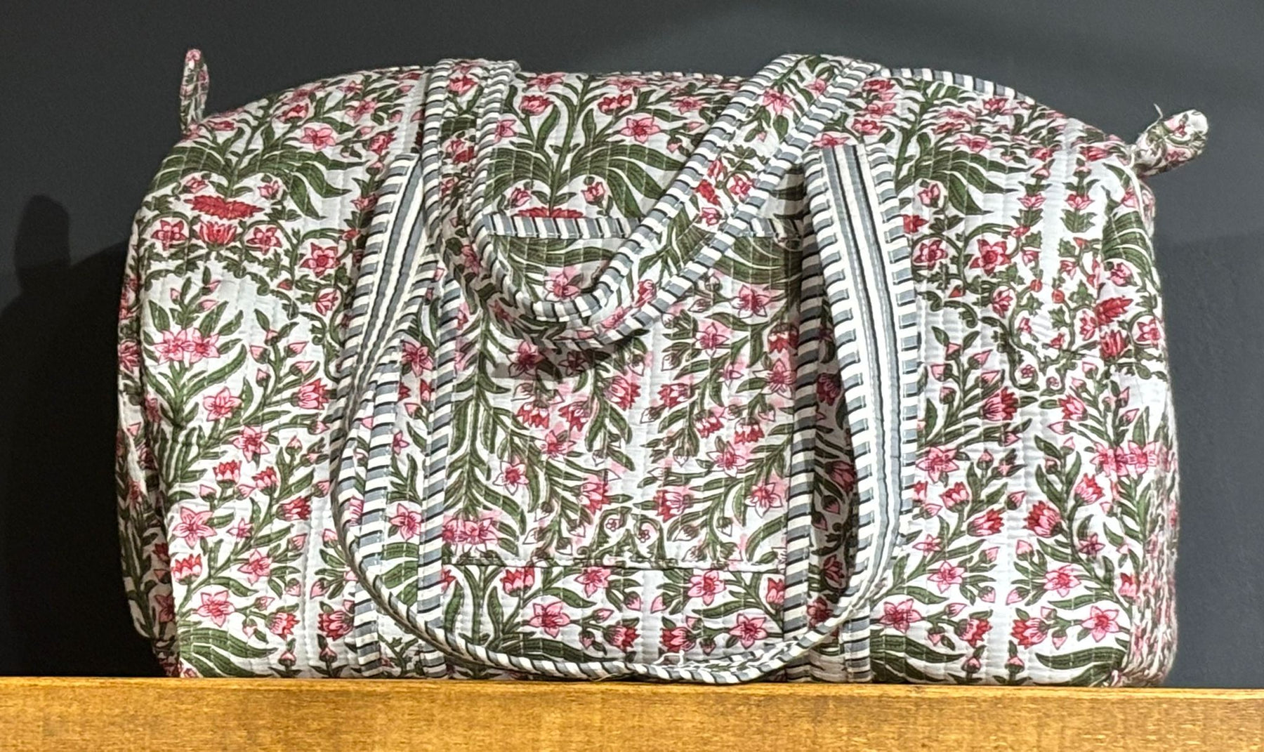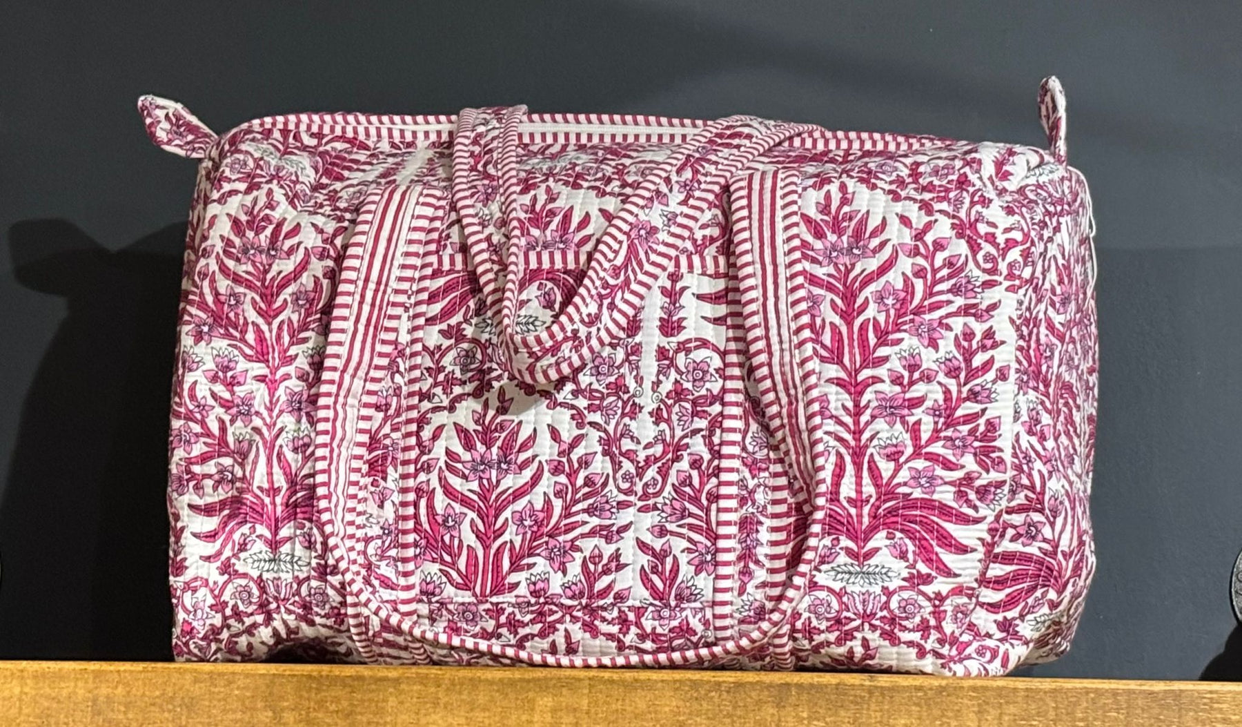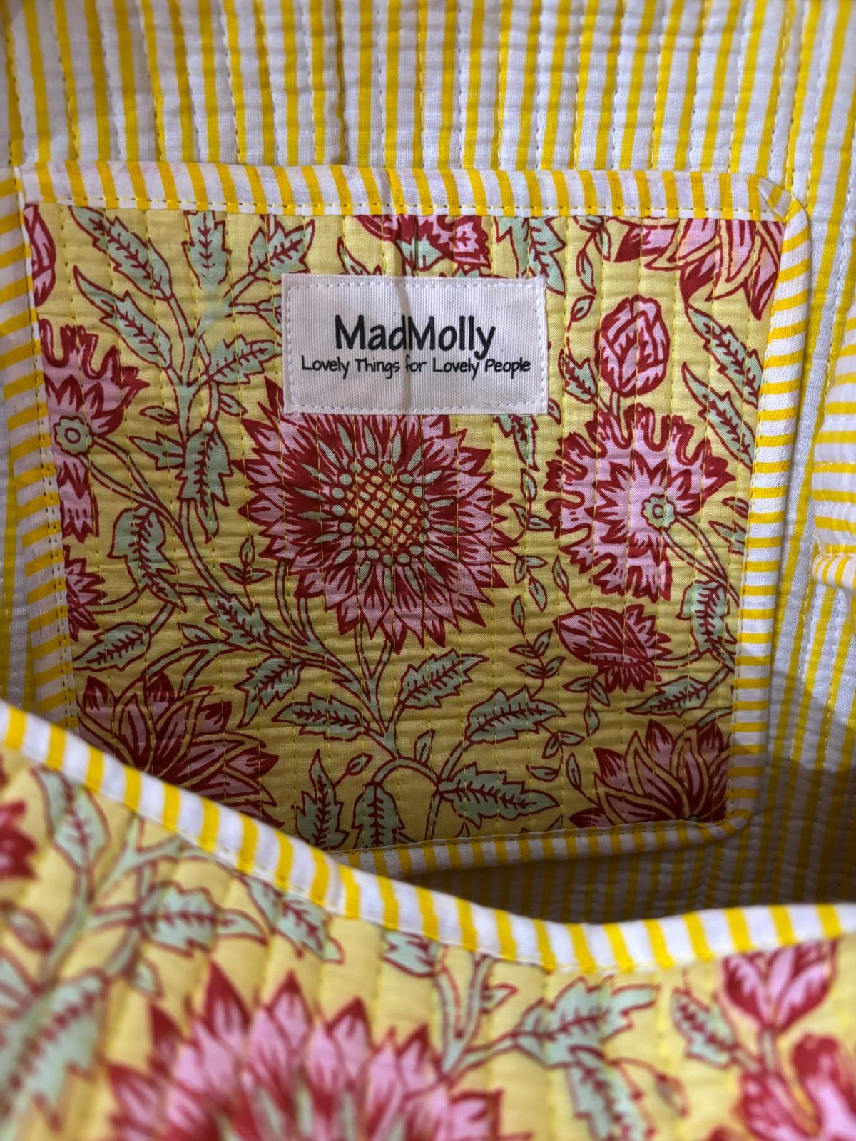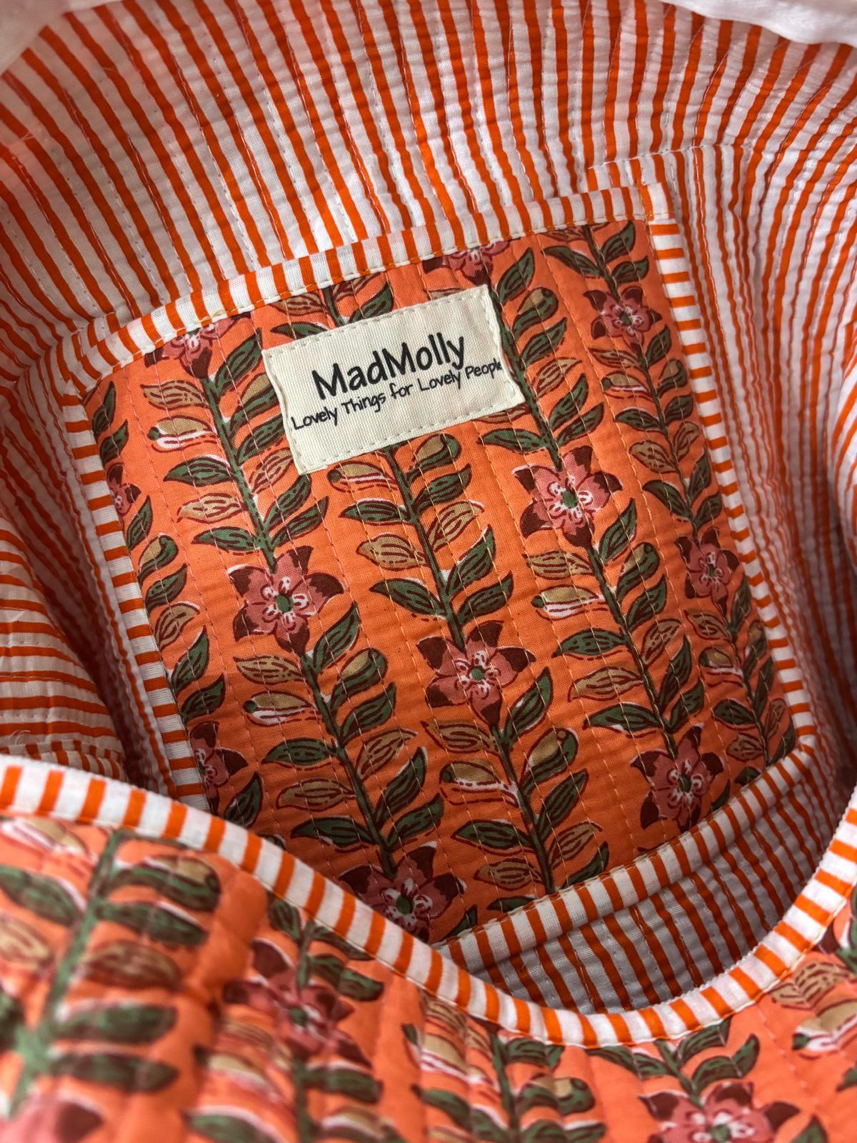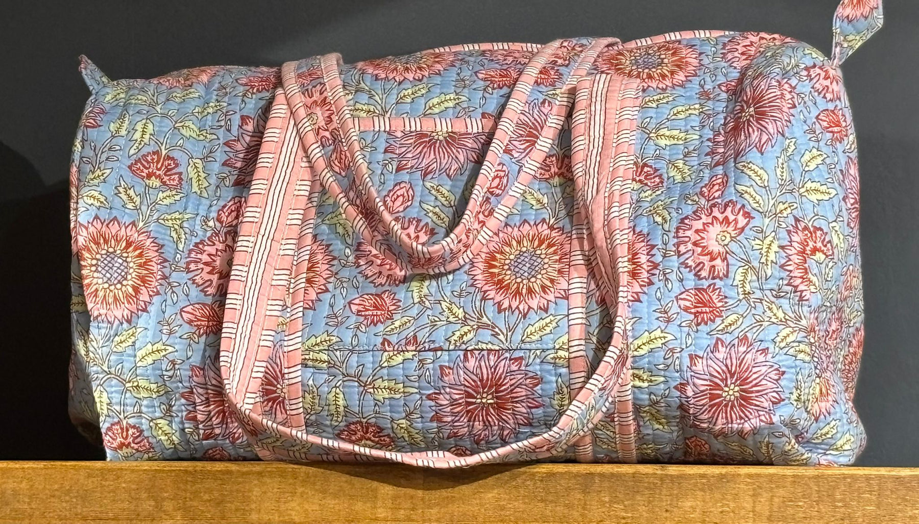 Beautiful MadMolly hand-block printed weekend barrel bags are made for us in Jaipur, India.