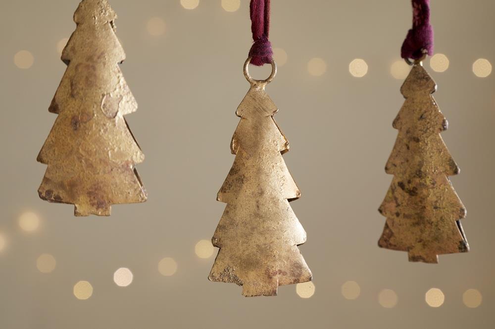 These iron baubles feature a striking tree silhouette with an antique brass finish, bringing warmth and character to any festive display. Their slim profile make them ideal for hanging on branches or incorporating into decorative arrangements.