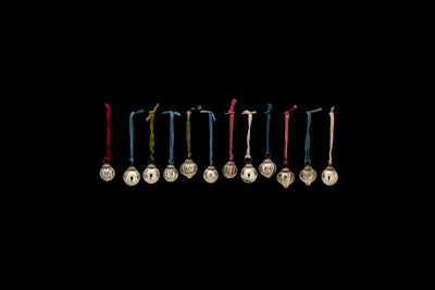 The baubles are sold in bags of 12. Each bauble has a rustic metal hoop and recycled sari tie.