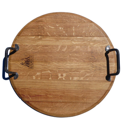 Coopers hew the wood and stack it in the open air, continuously dampening and curing it for years before handcrafting the planks into oak wine casks. Wine typically ages in the barrel for four years, receiving the oak’s distinctive flavor. When the oak's flavor diminishes, Australian Marketing + Design reclaims the barrel heads, running the coopers's craft in reverse. Every Provence Platter is handcrafted, resulting in unique markings, wood grains, and textures. For added functionality, the refinished cask heads are paired with hand-wrought iron handles making these serving pieces as durable as they are beautiful.