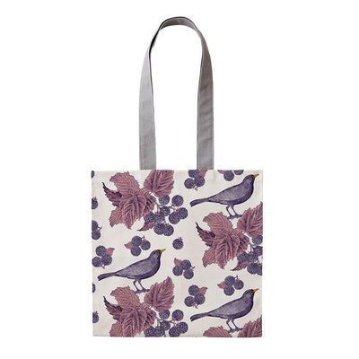 Cream Tote bag hand printed with purple blackbirds & brambles with pink leaf detail