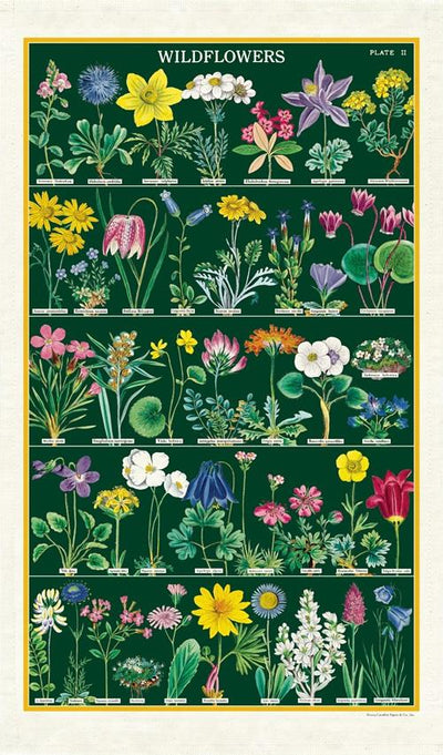 Cavallini - 100% Natural Cotton Vintage Tea Towel - 80 x 47cms - Wildflowers (Dark Green)